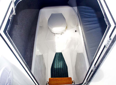 A l'avant de la zone walk-around, il y a une grande cabine avec revêtement, un double couchage et une zone où l'on peut se tenir debout, doté de toilettes électriques.